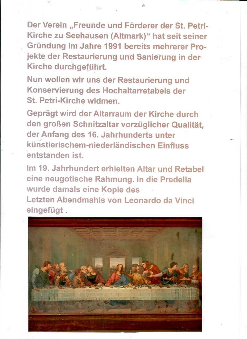 Im Zusammenhang mit der Restaurierung-Sanierung des Hochaltars in der St. Petri-Kirche in Seehausen wurde ein altes Altarbild aus dem Jahr 1711 wiederentdeckt.