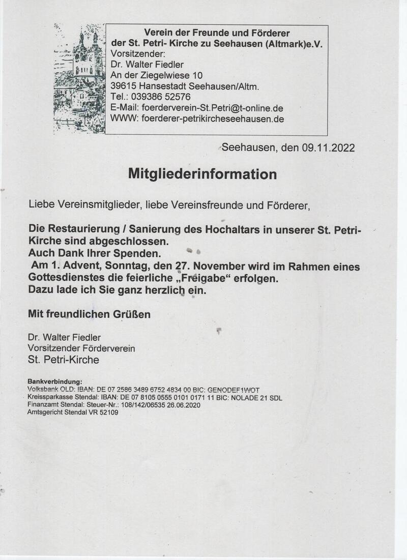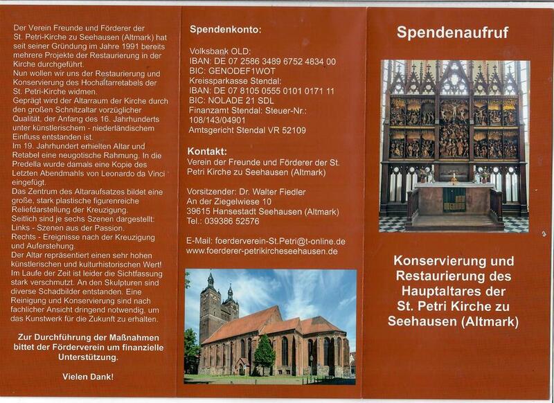 Im Zusammenhang mit der Erbringung der Eigenmittel zur Restaurierung / Sannierung des Altars in der St. Petri-Kirche in Seehausen, fand am 08. Oktober eine Kirchenbesichtigung von Vertretern der Kressparkasse Stendal statt. Man war erstaunt über die Kunst-und Denkmalschätze unserer Kirche und lobte die Initiativen des Fördervereins. Wertvolle Ratschläge zu einem Fördermittelantrag seitens der Stiftung des Ostdeutschen Sparkassenvereins zur Denkmalpflege wurden uns gegeben.