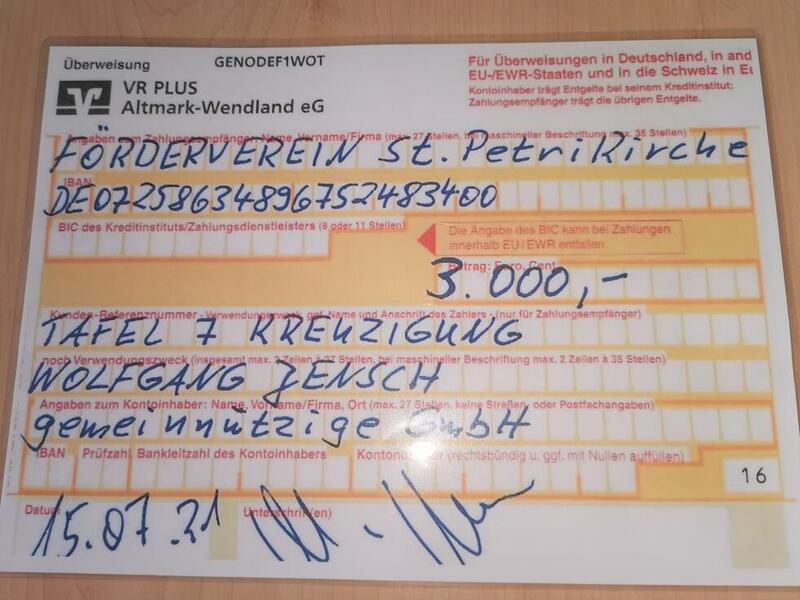 Die erste Grußspende für den Altar in der St. Petri-Kirche wurde heute übergeben.3000,00 €. Recht herzlichen Dank dafür. Die Aktion ist gut angelaufen. Es haben sich schon weitere "Personen-Paten" mit entsprechenden fginanziellen Beträgen registrieren lassen.
