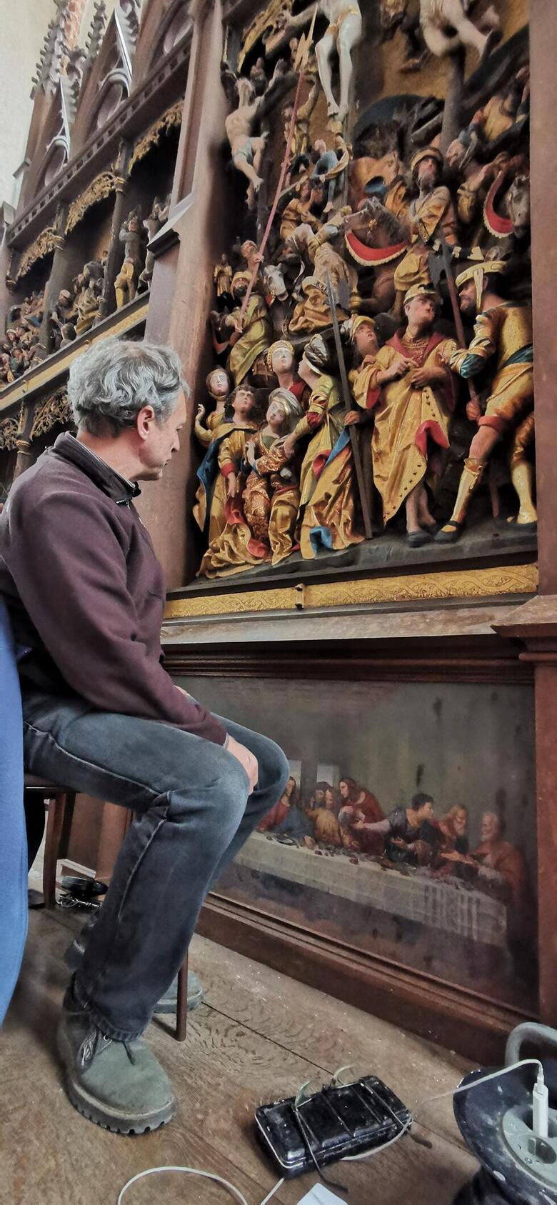 Herr Dirk Jacob, Diplom Restaurator aus Berlin, hat am 16. Mai mit seinen Arbeiten der Restaurierung und Konservierung unseres Altars in der St. Petri-Kirche begonnen.